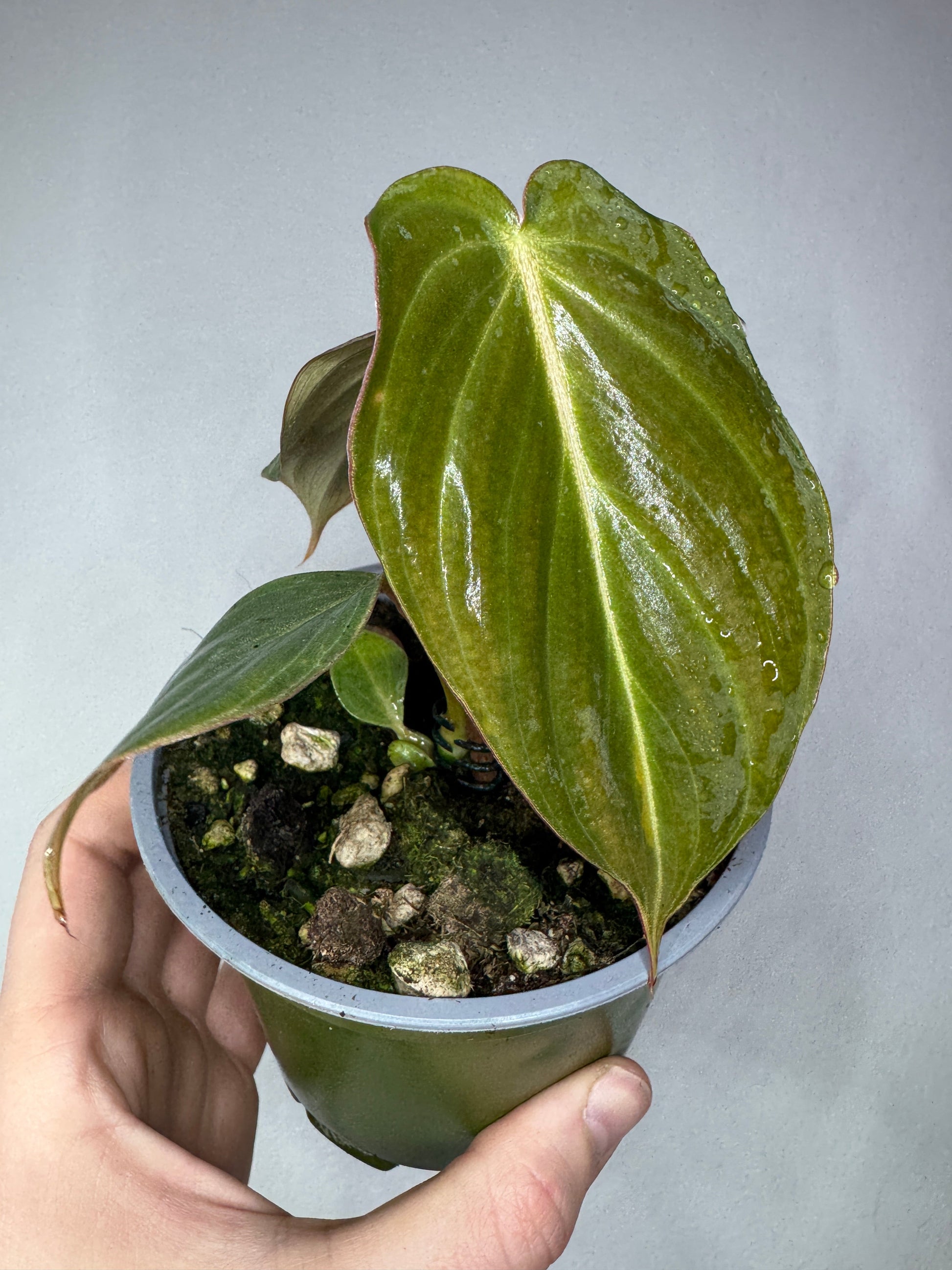 Philodendron 'Glorious' is a rare and beautiful hybrid between Philodendron gloriosum and Philodendron melanochrysum . This plant combines the velvety texture of melanochrysum with the creeping habit of gloriosum, making it a striking yet manageable choice for indoor plant enthusiasts. Its large, velvety, heart-shaped leaves with prominent veins make it a true showstopper in any plant collection.