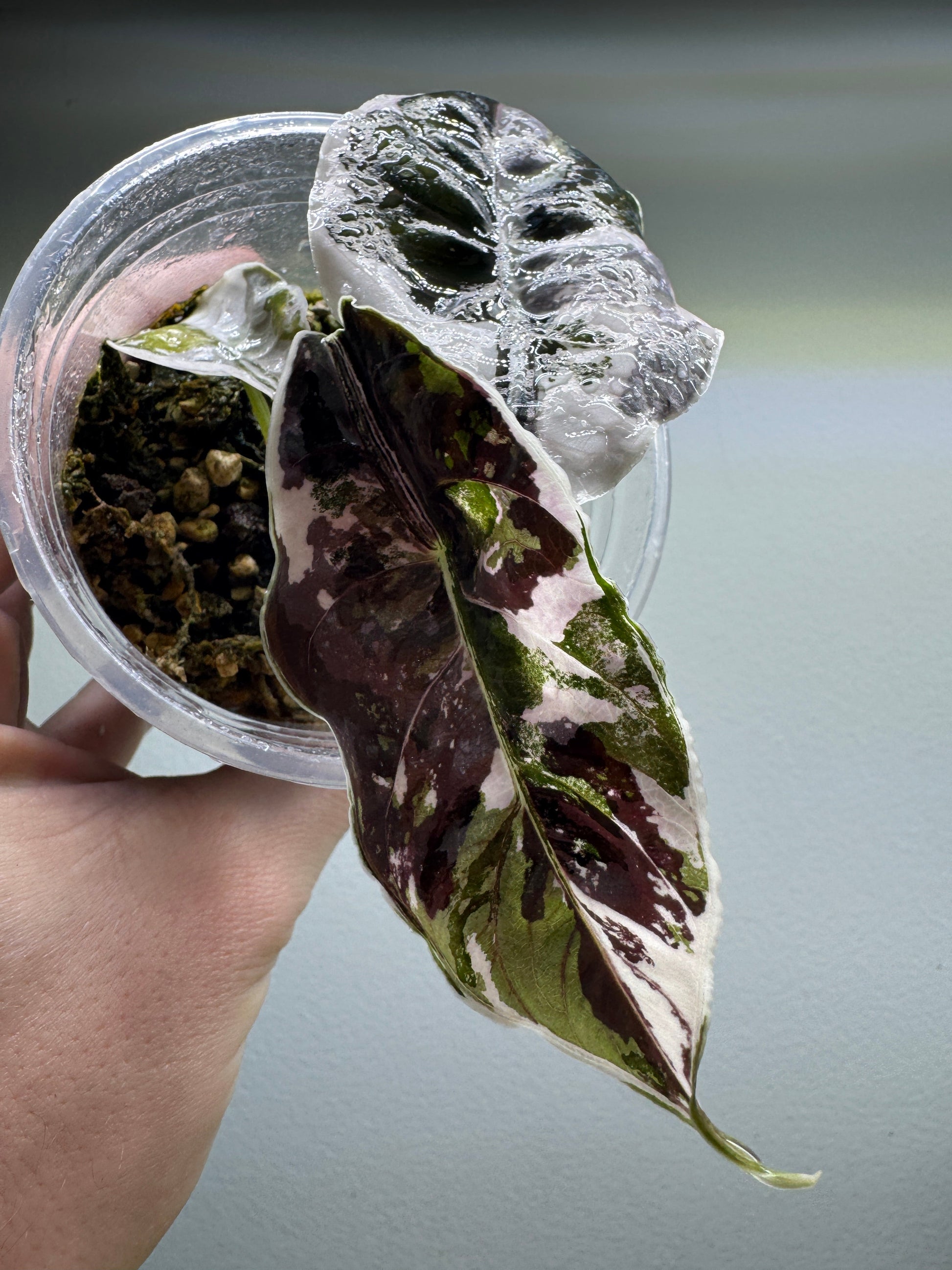 Alocasia azlanii Variegata is a highly sought-after exotic plant known for its metallic, jewel-toned leaves streaked with creamy white and blush pink variegation. Native to Borneo, this rare plant is prized for its glossy, iridescent foliage that shimmers in the light—made even more captivating by unpredictable variegation patterns. As a compact and truly unique plant, it’s perfect for collectors and anyone looking to add a showpiece to their indoor jungle.